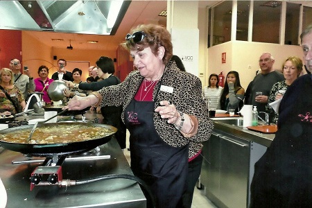 Here is another entry to my Spain adventure. One of ours stops was in the town of Valencia. While there we visited the Valencia Club Cocina. This was a culinary college and its agenda for the day was to teach us to make Paella Valencia. In the picture you will see me with the two teaching chefs George and Mario. We are holding an extra-large pan that we used to make the paella. I was asked to assist the chefs in making the paella which we then served to the entire tour group. Here is the recipe: Ingredients; 2 cups olive oil; 2 pounds chicken cut into pieces 2 pounds of pork cut into pieces 1/2 teaspoon paprika; 1/2 tomato, grapped; 4 1/2 cups water 1 1/3 pounds rice; salt and fresh rosemary and 1 pinch of saffron for coloring. Fry meat in olive oil in pan until golden brown. Add paprika half way through browning process. Push meat to edge of pan and place tomatoes in the center of pan. Add half of the water simmer for 30 minutes until most of the water has evaporated. Add rice evenly over pan and fry for a few minutes, add the rest of the water and cook for 20 minutes. Season with salt and pepper add saffron for color. Once this is done the paella should not be stirred anymore For the last two minutes increase the heat to high until the layer of rice starts to caramelize, creating what Valencians call the "socarrat." If the rice starts to burn remove the pan from the heat immediately. Let set for a few minutes before serving. We also made Andalusian Gazpacho and Sangria. If I were to do another cook book these recipes would certainly be included.